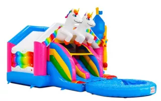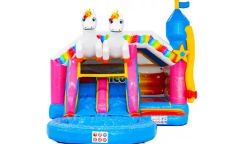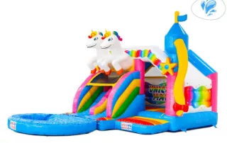 Envolez-vous avec les licornes et plongez dans un univers féerique ! Ce château gonflable magique combine une grande aire de saut, deux toboggans et une piscine pour offrir des heures de plaisir aux enfants. Grimpez, rebondissez et glissez dans un décor enchanteur qui émerveillera petits et grands.